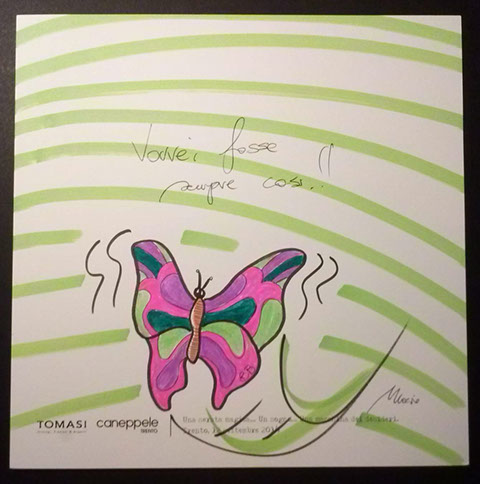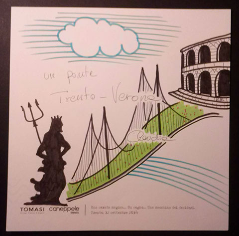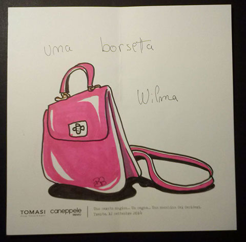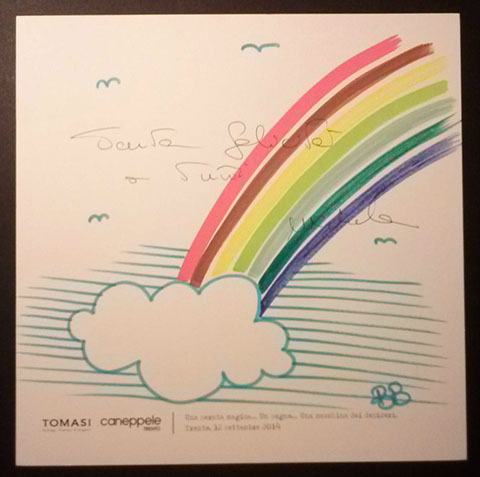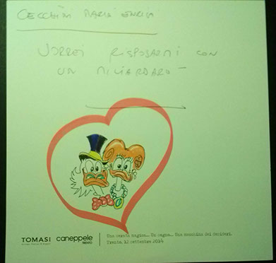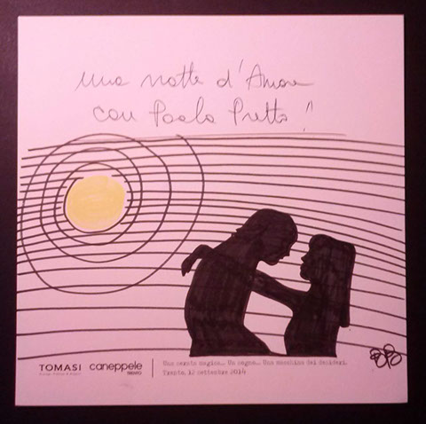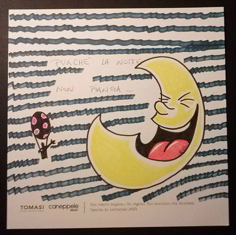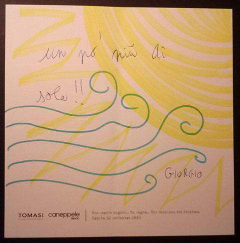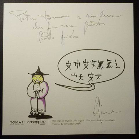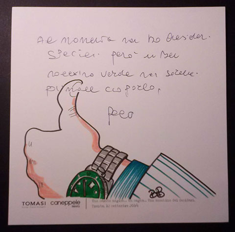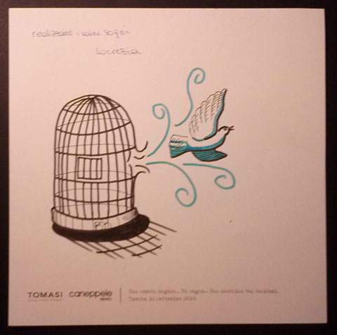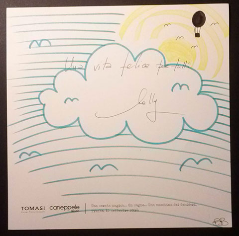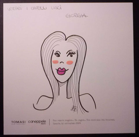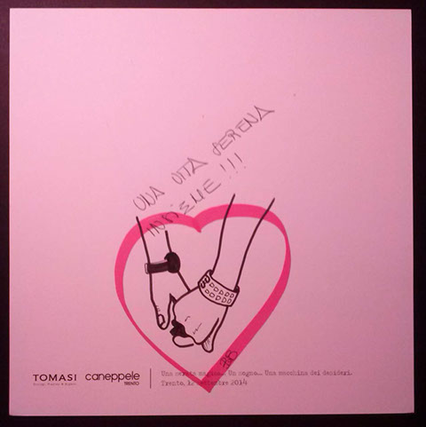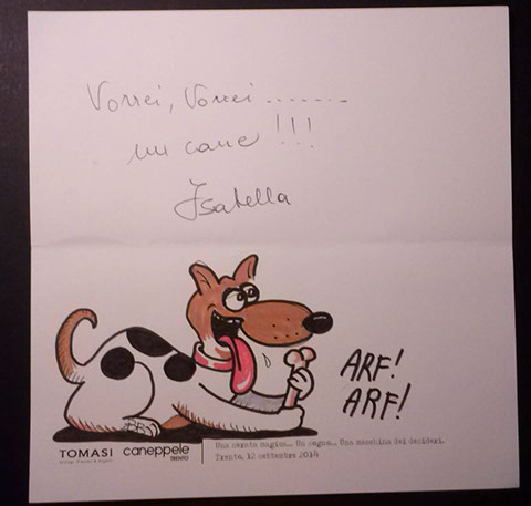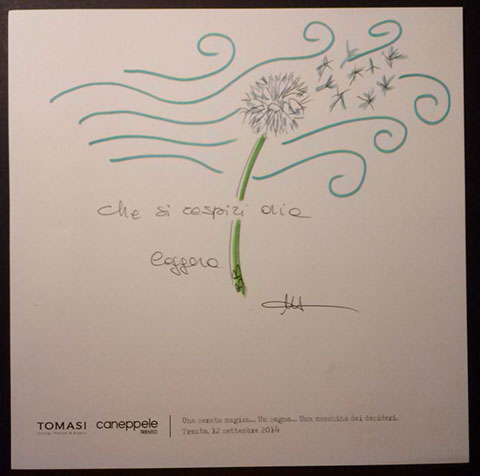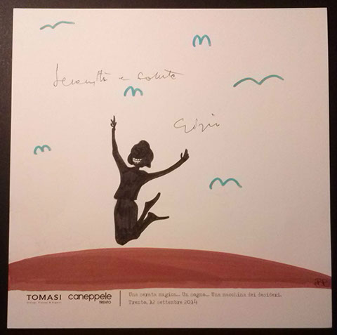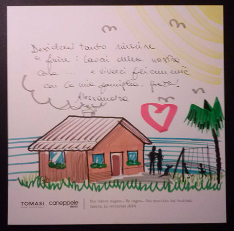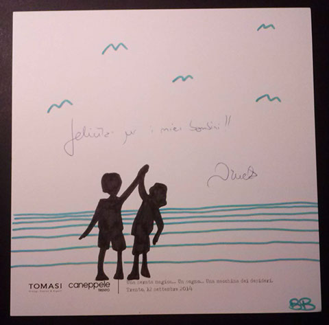 Il giorno sabato 12 settembre 2014 la Gioielleria Tomasi e Caneppele Abbigliameto hanno organizzato un evento allestendo degli eleganti salotti all'esterno tra i due negozi, in pieno centro storico. Gli artisti Biciob e Umberto hanno"creato" LA MACCHINA DEI DESIDERI : i clienti entravano nella gioielleria e, tre le altre cose, potevano scrivere un desiderio su un cartoncino e poi infilarlo nella fessura di un pannello. Dietro a questo, gli artisti nascosti alla vista, disegnavano velocemente la vignetta del desiderio di ogni singolo cartoncino, per poi rimandarlo in direzione del negozio. Quella sera ne abbiamo fatti parecchi. Qui alcune immagini create da Biciob.